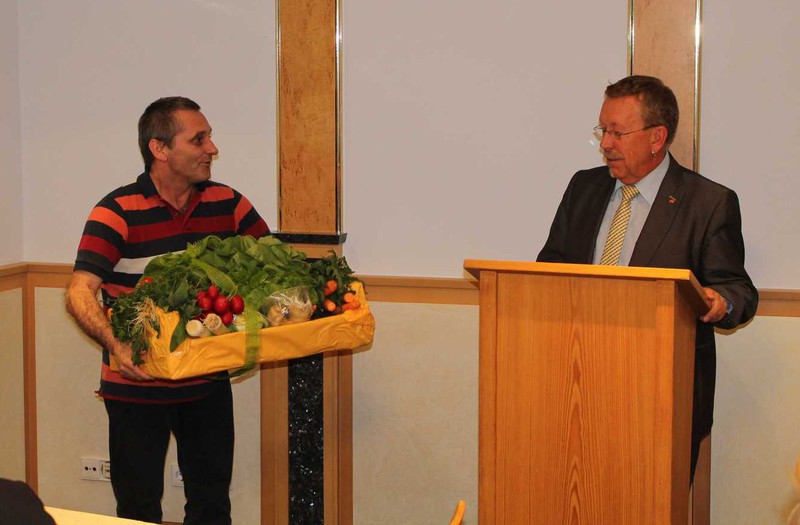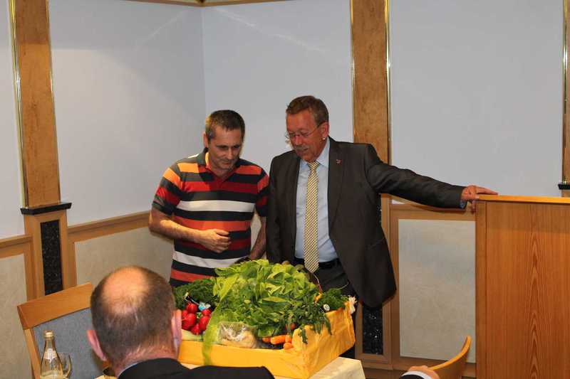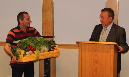 Mit einem riesigen Gemüsekorb, welcher standesgemäß für die Gärtnerstadt Gundelfingen ist, bedankte sich Roman Schnalzger und wünschte Brunner, dass ihm die vielen Vitamine helfen werden, die doch sehr anspruchsvolle Arbeit weiter so gut fort führen zu können.