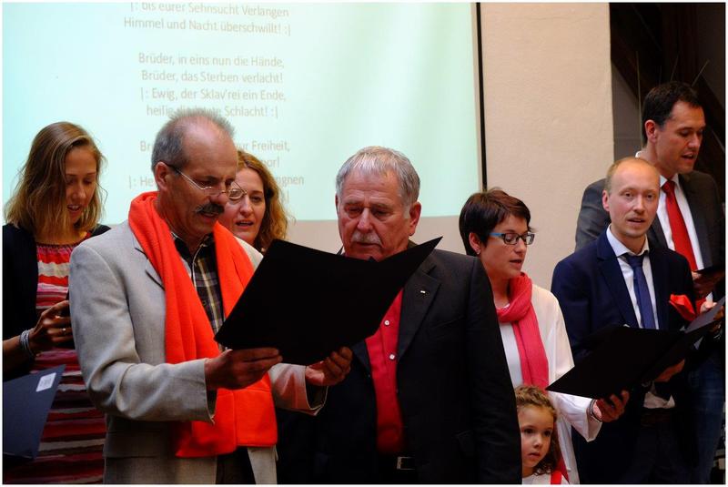 Ein besonderes Highlight des Abends war der „Revolutionschor“ der Gundelfinger Sozialdemokraten unter Leitung von Hans Stenke und Bernd Duschek. Mit „Brüder zur Sonne“, „Wann wir schreiten Seit an Seit“ und der „Internationalen“ sorgten die Sängerinnen und Sänger nicht nur für große Begeisterung, teilweise sangen auch alle Gäste im Rosenschloss lauthals mit und sorgten für einen wunderbaren Abschluss des Abends.