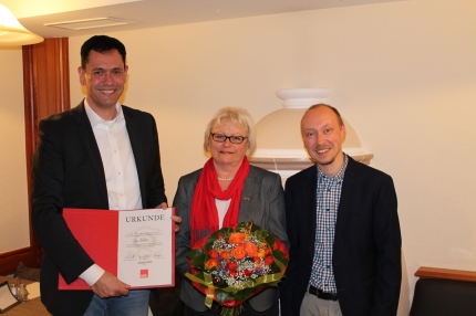 Ein besonderes Ereignis ehrten dabei die Gundelfinger Genossen. Vera Schweizer, konnte vor wenigen Wochen ihre 50jährige Mitgliedschaft in der SPD feiern. Schweizer vertritt die Sozialdemokraten seit 1990 im Kreistag des Landkreises Dillingen und seit 2002 arbeitet sie aktiv und nachhaltig im Gundelfinger Stadtrat. Als besondere Wertschätzung der Gundelinger Bevölkerung kann das mehrfache Abschneiden als Stimmenkönigin bei den Stadtratswahlen bezeichnet werden. Reduzieren auf ihren verstorbenen Ehemann Peter Schweizer, 27 Jahre Bürgermeister der Stadt Gundelfingen, kann man Vera Schweizer auf gar keinen Fall. Schon immer hat sie sich um diejenigen gekümmert, die besonders viel Hilfe und Zuwendung in unserer Gesellschaft benötigen. Als Vorsitzende der Gundelfinger Ortsgruppe der Arbeiter-Wohlfahrt und als Referentin für Jugend und Soziales im Gundelfinger Stadtrat setzt sich Vera Schweizer vor allem für Kinder, Jugendliche und Senioren ein. Daher war sie auch sofort dabei, als es darum ging, die Hilfe für Asylsuchende in Gundelfingen auf die Beine zu stellen und selber Hand anzulegen. Nicht nur durch ihre 50jährige Mitgliedschaft in der SPD, vor allem wegen ihrem Handeln ist die 68jährige ein Vorbild für die Mitglieder der Gundelfinger SPD. Ortsvorsitzender Benjamin Geiger und Fraktionsvorsitzender Jürgen Hartshauser bedankten sich bei Vera Schweizer für ihr großes Engagement. Sie gaben auch der Hoffnung Ausdruck, dass dieses Jubiläum mehr Motivation für weitere aktive Jahre im Kreis der Sozialdemokraten sei, als ein Zeichen um etwas kürzer zu treten.