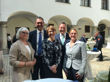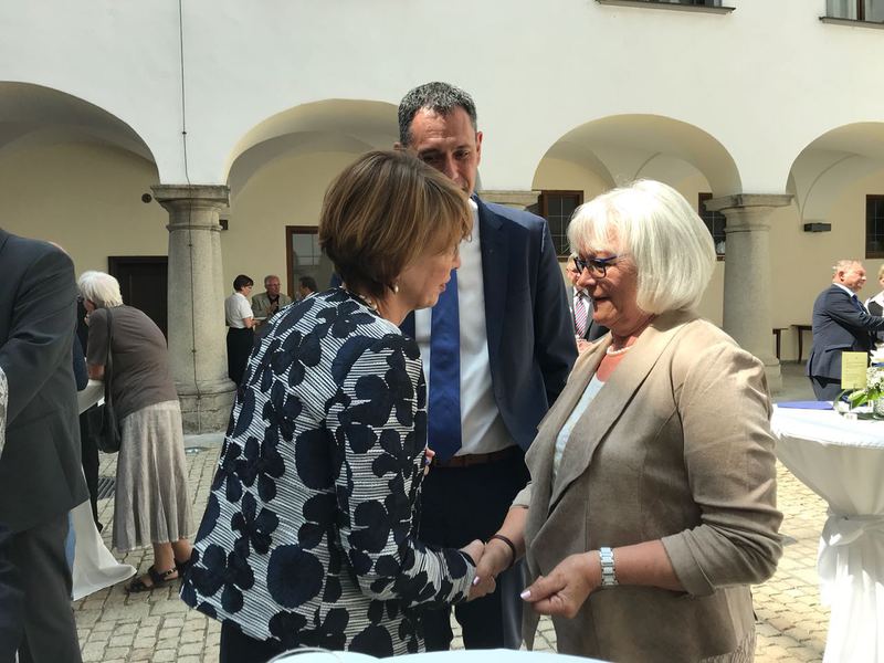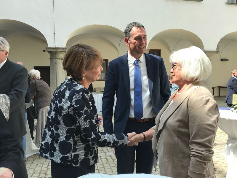 Im Rahmen der Verleihung des Europäischen Ulrichspreises des Landkreises Dillingen an die Nothilfeorganisation „Ärzte ohne Grenzen“ hielt Frau Elke Büdenbender, Ehefrau des deutschen Bundespräsidenten Frank-Walter Steinmeier, die Laudatio in der Dillinger Studienkirche. Beim anschließenden Empfang im Arkadenhof der Akademie für Lehrerfortbildung suchten die SPD-Kreisräte Mirjam Steiner aus Syrgenstein und die beiden Gundelfinger SPD-Kreisräte Vera Schweizer und Jürgen Hartshauser das Gespräch mit der Schirmherrin der deutschen UNICEF. Bei Frau Büdenbender fanden sie dabei mit ihren Anliegen ein offenes Ohr. Angetan von der sehr sympathischen Art richteten die drei SPD-Kreisräte Grüße an den deutschen Bundespräsidenten aus und gaben der Hoffnung Ausdruck, dass Frau Büdenbender beim nächsten Mal zusammen mit ihrem Ehemann den Landkreis Dillingen besucht.