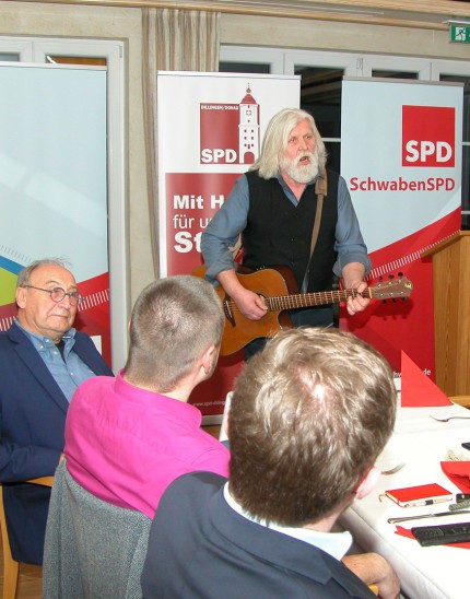 Der Politische Aschermittwoch des SPD-Unterbezirkes Dillingen stand im Zeichen der Kommunalwahl 2020. Im Gegensatz zu anderen Veranstaltungen an diesem Tag standen nicht scharfe Attacken gegen den politischen Gegner im Vordergrund. Gemäß dem Motto „Zukunft beginnt vor Ort“ stellten vielmehr Mirjam Steiner –Bürgermeisterkandidatin in Syrgenstein-, Tobias Rief – OB-Kandidat in Dillingen – und Thomas Reicherzer –Bürgermeisterkandidat in Wittislingen – Ziele sozialdemokratischer Kommunalpolitik vor. Liedermacher Sepp Raith gestaltete die musikalische Umrahmung mit Liedern und Gedichten sozialkritischer Art.