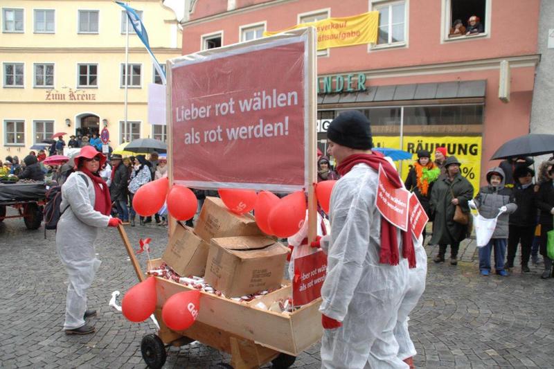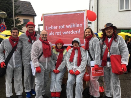 Unter dem Motto „Lieber rot wählen als rot werden“ nahm in diesem Jahr der Gundelfinger SPD-Ortsverein am Faschingsumzug teil. Von dem schlechten Wetter unbeeindruckt zogen die roten Genossen mit dem Gaudiwurm durch die Gundelfinger Innenstadt. Dabei hatten nicht nur die Zuschauer viel Spaß, sondern auch die Fußgruppe der Gundelfinger Sozialdemokraten, an der sich auch einige der Kandidaten für die anstehenden Stadtrats- und Kreistagswahlen beteiligten. Mit dabei: Birgit Spengler, Anna, Marcella und Bernd Duschek, Silke Schnürer, Max Ruchti, Enrico Oeser, Heike und Thomas Lindenmayr, Miriam und Jürgen Hartshauser.