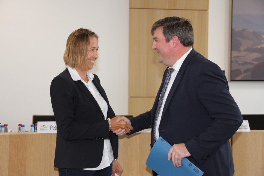 Landrat Markus Müller hat in gleicher Sitzung den nach Art. 24 Abs. 4 Satz 2 LKrO festgelegten Eid Birgit Spengler abgenommen und sie als neue Kreisrätin des Landkreises Dillingen begrüßt.
