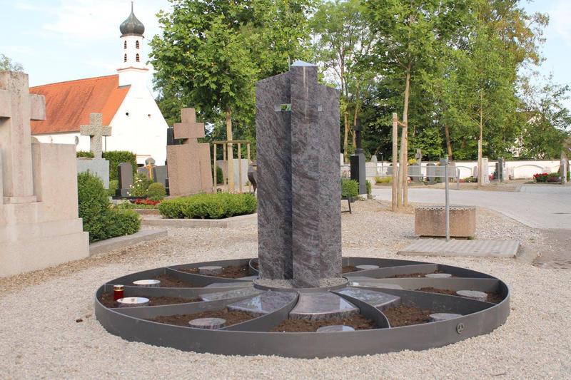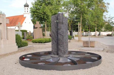 Schnell ist es gegangen mit der Umsetzung und Fertigstellung der neuen Urnenringanlage. Links in unmittelbarer Nähe zu der Aussegnungshalle hat sie ihren Platz gefunden und bietet dort 10 neue Urnenbegräbnis-möglichkeiten. Hier wird den Hinterbliebenen die Möglichkeit gegeben den Verstorbenen in einem würdevollen Ambiente zu gedenken.